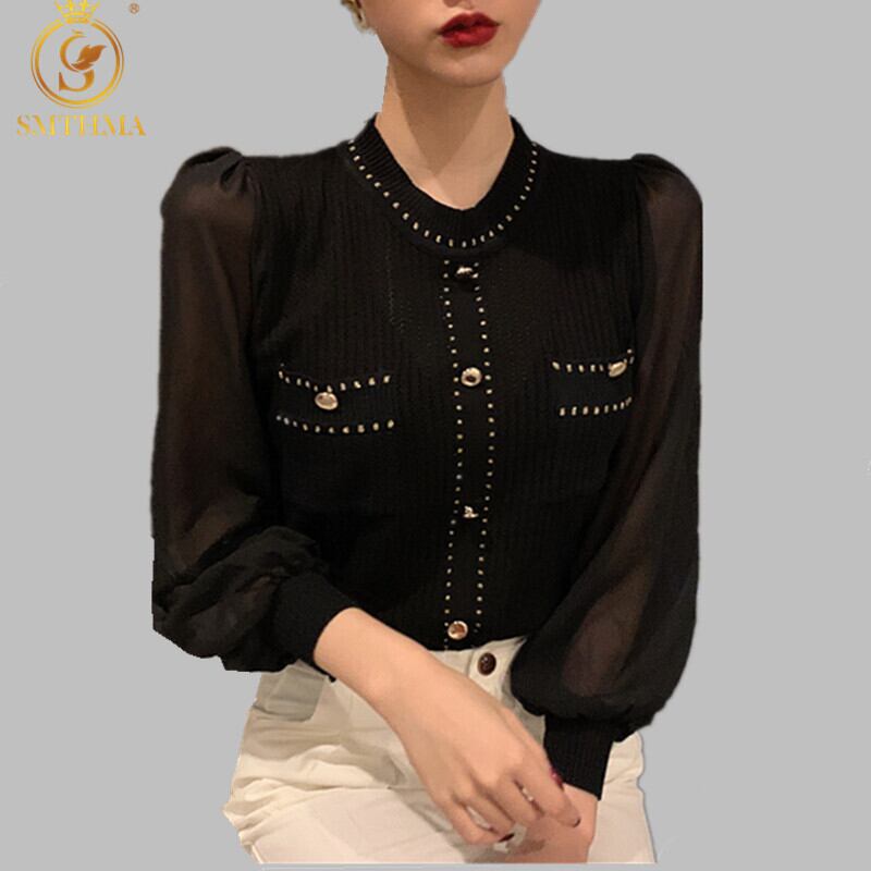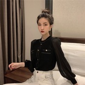 【新作】【送料無料】 SMTHMA2020春の女性のトレンディなシフォンパッチワーク長袖tOPS黒と白のニットTシャツトップ ロング ホワイト ブラック スプリング 春物 AL Feminine24694766497