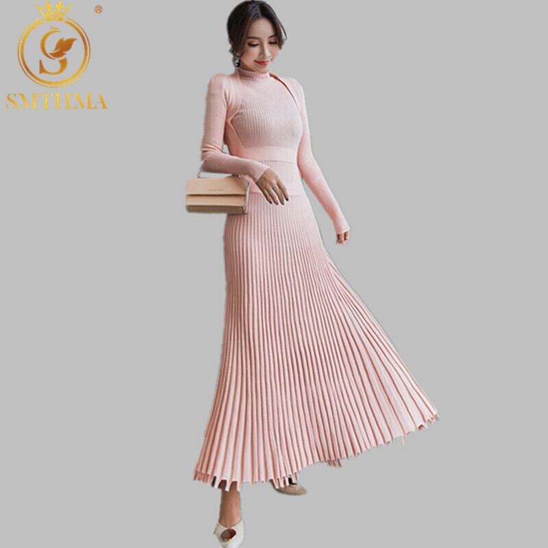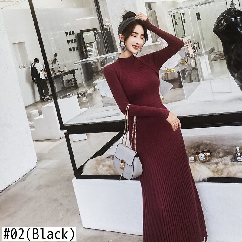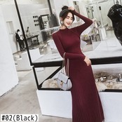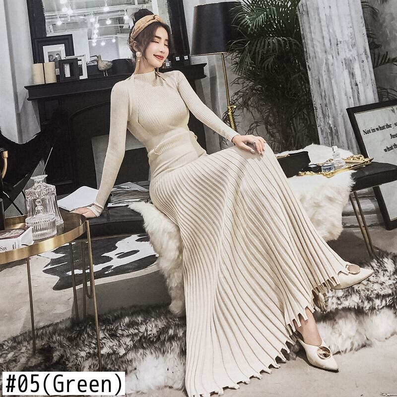 【新作】【送料無料】 秋冬ロングニットワンピースレディースランウェイスタンドカラースリムシックウォームセータープリーツドレス オータム 秋物 ウィンター 冬物 AL Feminine278379415556