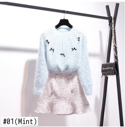 【新作】【送料無料】 SMTHMA秋冬ツーピースセットレディースビーディングボウニットセーター+ウエストツイードチェック柄マーメイドスカートセット リボン オータム 秋物 ウィンター 冬物 AL Feminine244988729333 | Feminine