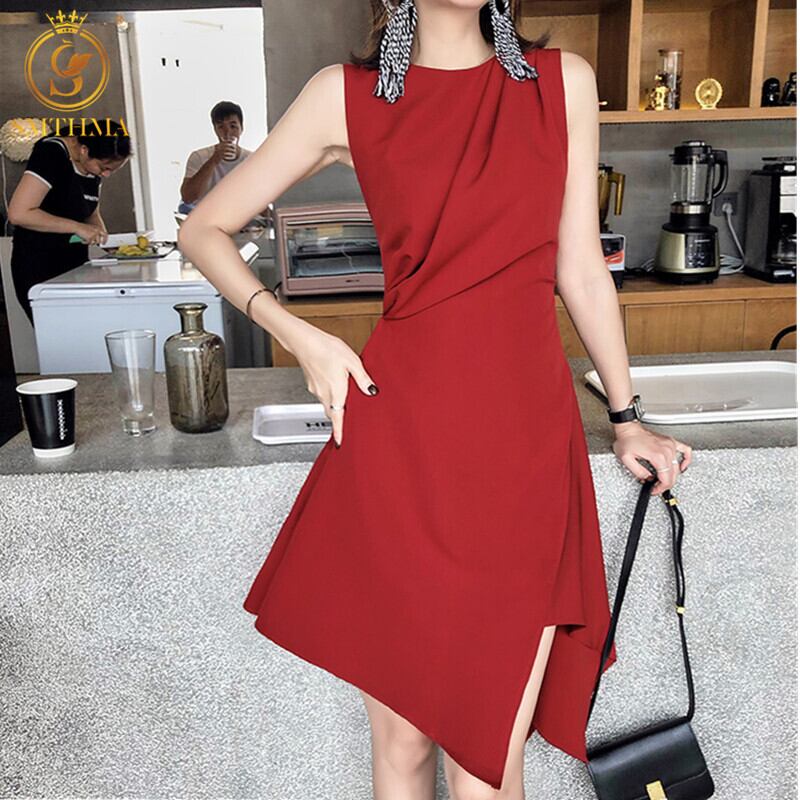 【新作】【送料無料】 SMTHMA2020夏の女性の無地のドレスvestidosの女性ノースリーブのフリルの不規則な赤いドレス レッド サマー 夏物 ソリッドカラー AL Feminine261240883595 | Feminine