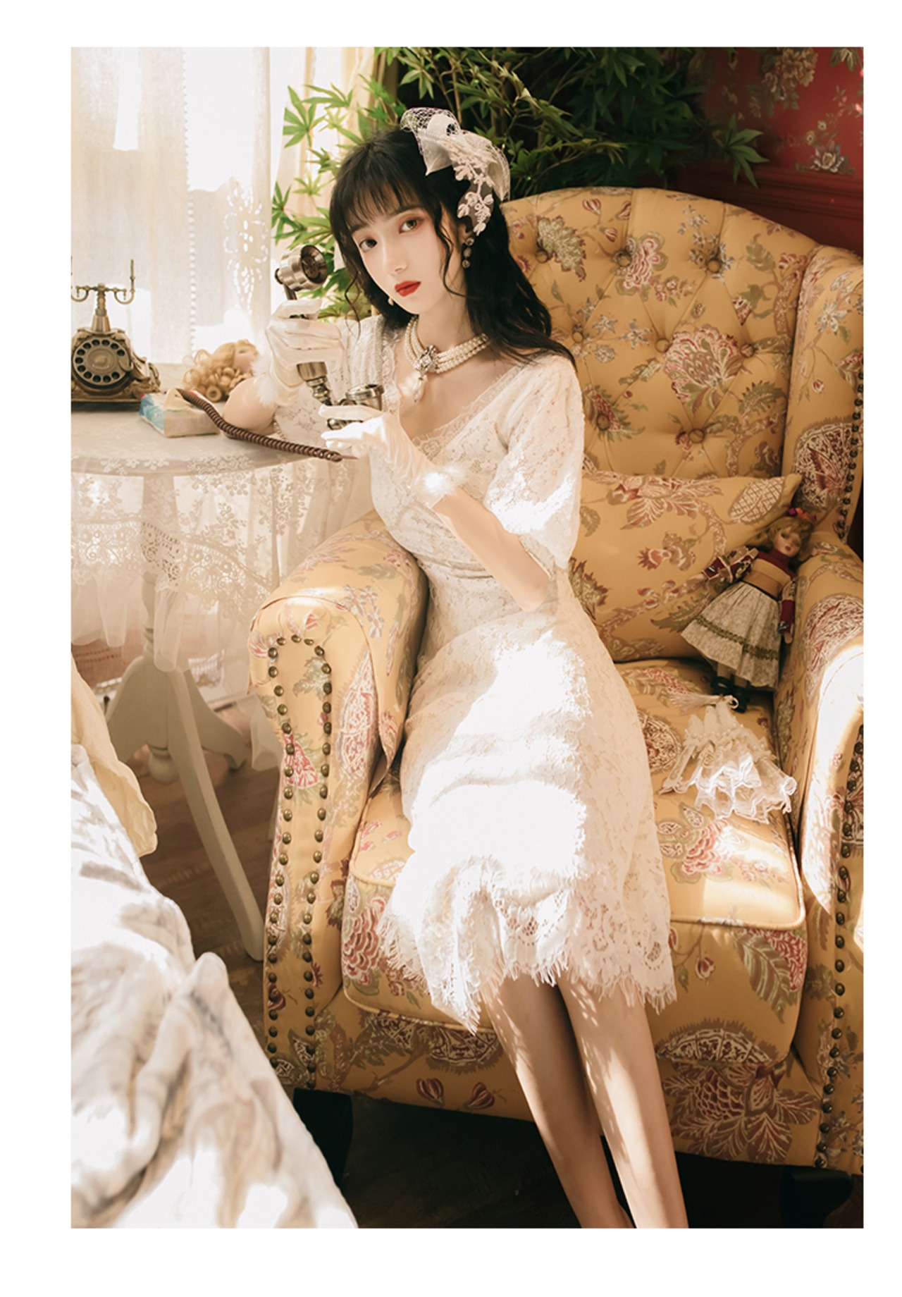 【新作】【送料無料】 2020品質の豪華なデザイン滑走路レース中空アウトダイヤモンドドレス女性セクシーなVネックパフスリーブウエストパーティードレス AL Feminine257473080399 | Feminine