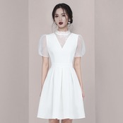 【新作】【送料無料】 SMTHMA2020オフィスレディ滑走路ドレスメッシュパフスリーブレースパッチワーク女性ホワイトミニドレスVestoidos 会社 学校 通勤や通学にも AL Feminine237016731152 | Feminine