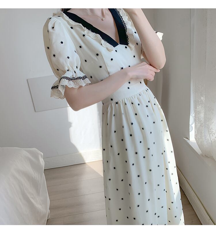 【新作】【送料無料】 SMTHMAサマースウィートスタイルの女性のドレスセクシーなVネックの水玉レースのフリルドレス女性のウエストドレスVestoidos 大人ガーリー キュート カジュアル 夏物 AL Feminine259754436995 | Feminine