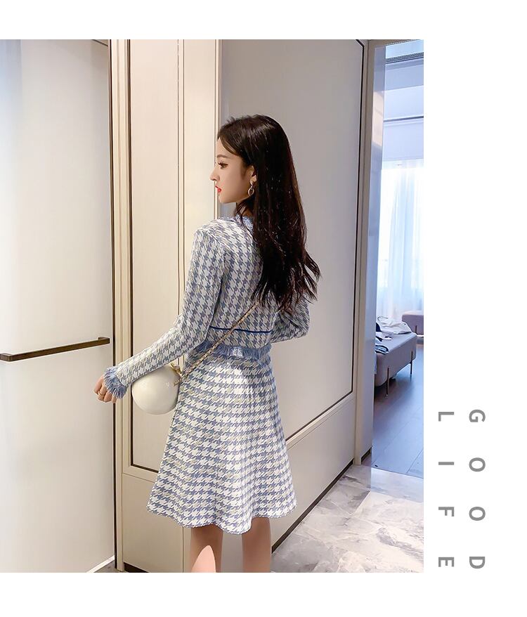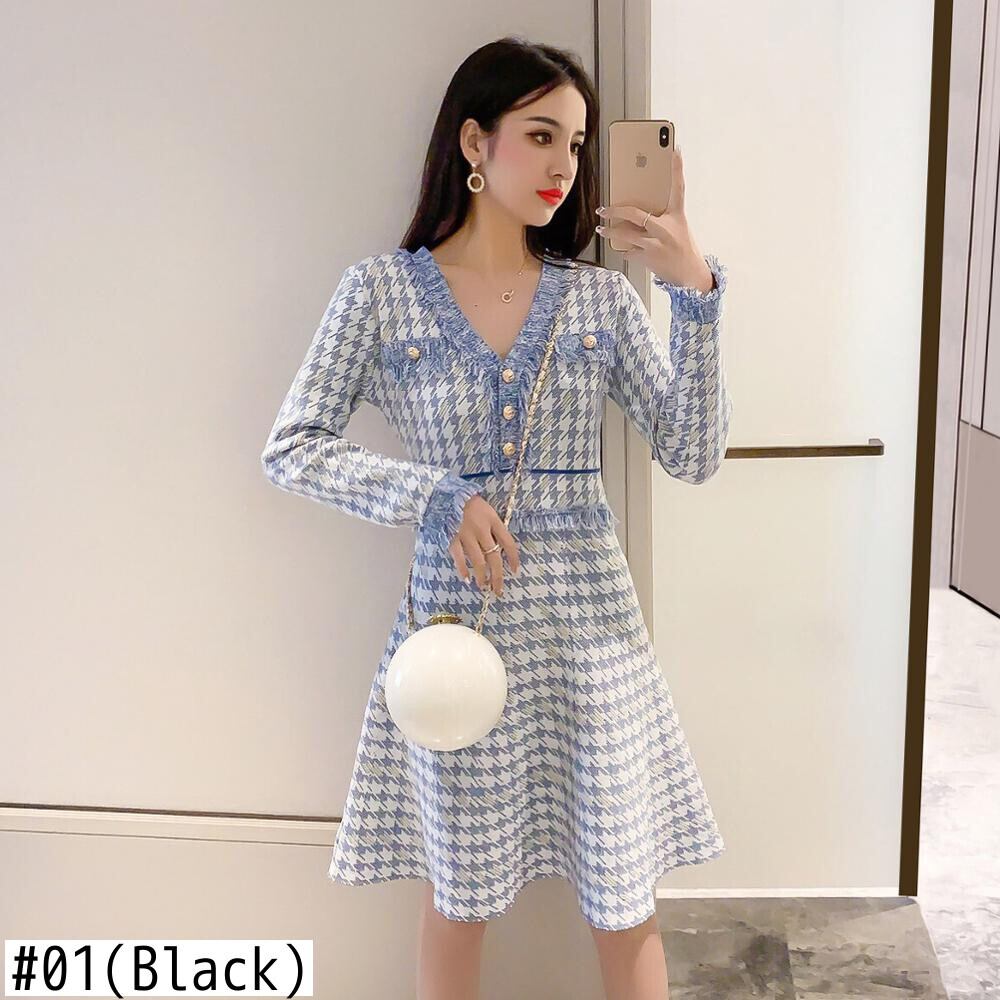 【新作】【送料無料】 2020冬のセクシーなVネック千鳥格子ニットドレス長袖ウエストテルトリムシックなドレス ロング ウィンター 冬物 AL Feminine291639503604 | Feminine