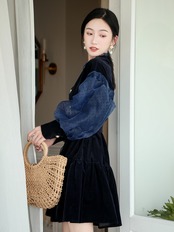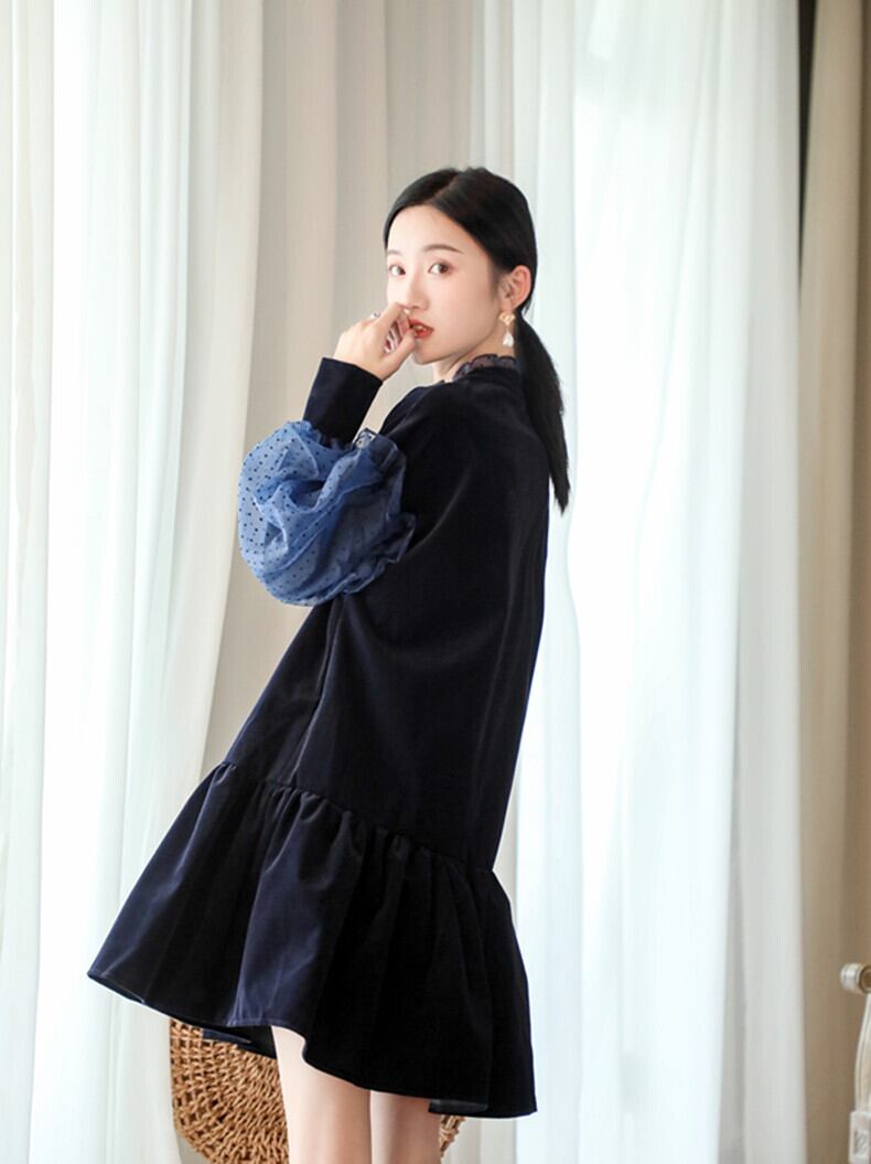 【新作】【送料無料】 SMTHMA2020秋冬女性ランタンスリーブランウェイドレスベルベットパッチワークメッシュドット女性シックタイアップドレス オータム 秋物 ウィンター 冬物 AL Feminine260638463795 | Feminine