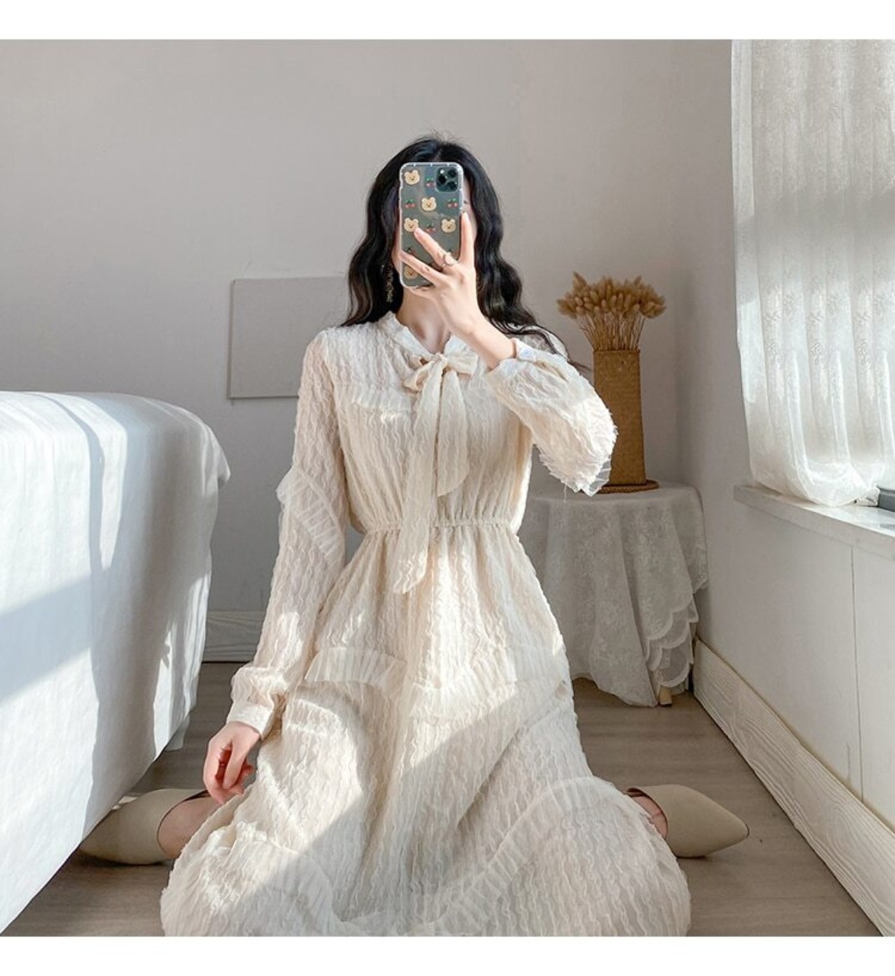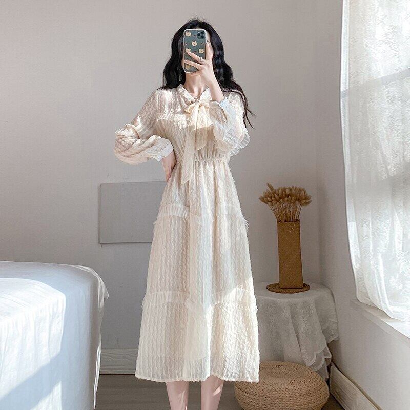 【新作】【送料無料】 SMTHMAボウネックレディース伸縮性ウエストドレス長袖フリルロングドレスドレス2020春Vestidos リボン エラスティック スプリング 春物 AL Feminine292844322934 | Feminine