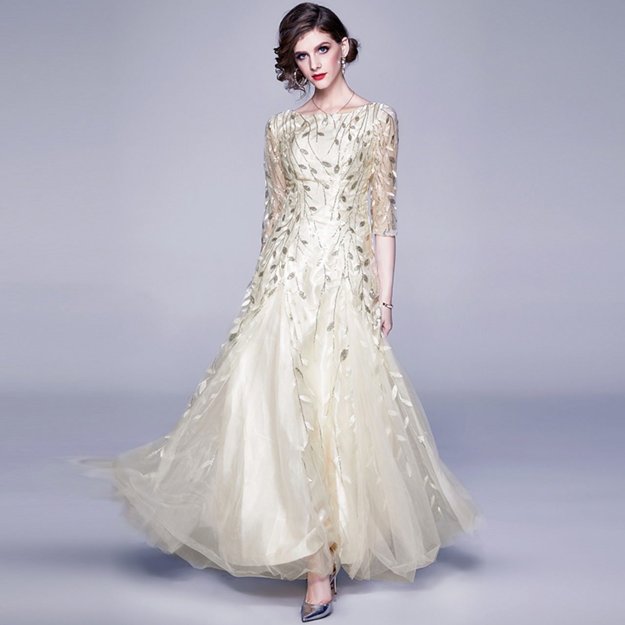 【新作】【送料無料】 滑走路マキシドレス女性のエレガントな長袖スパンコール刺繡の葉ドレス高度な質感エレガントで高貴なパーティードレス ロング 刺繍 AL Feminine258902454221 | Feminine