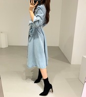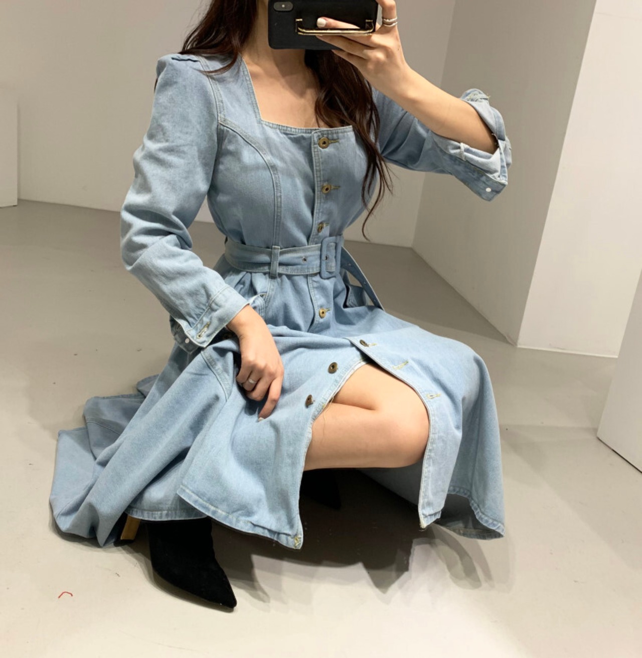 【新作】【送料無料】 SMTHMA2020秋冬レディースデニムドレスミッドカーフスクエアカラーシングルブレストポケットオフィスシックなドレス オータム 秋物 ウィンター 冬物 スクウェア 会社 学校 通勤や通学にも AL Feminine270279673957 | Feminine