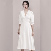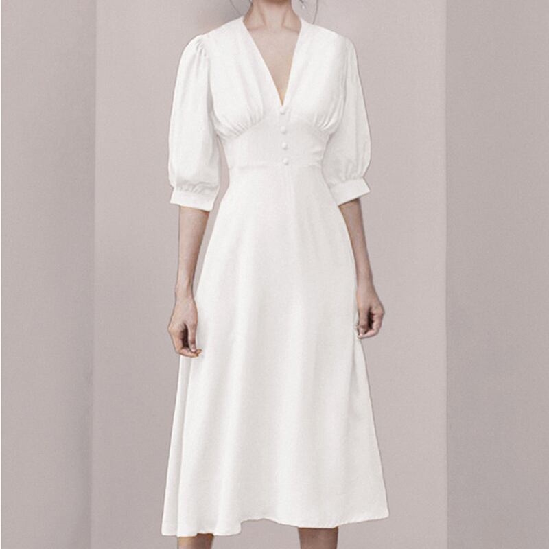 【新作】【送料無料】 SMTHMA2020夏の女性シングルブレストミッドカーフホワイトドレスシックなソリッドロングドレス サマー 夏物 ソリッドカラー AL Feminine250693737538 | Feminine
