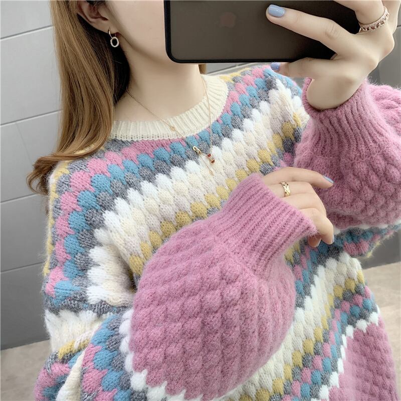 【新作】【送料無料】 SMTHMA2020ウィンターウォームストライプニット特大ルーズプルオーバーセータースーツ+ウエスト2枚スカートニットセット 冬物 AL Feminine232595215358