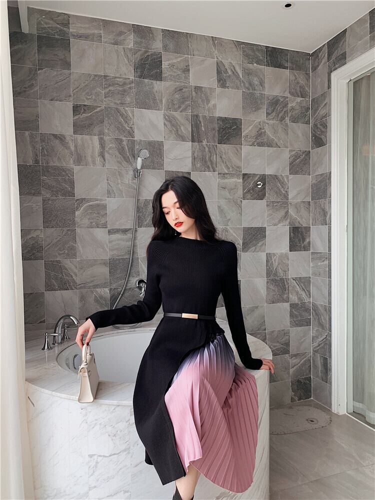 【新作】【送料無料】 SMTHMA2020ファッション女性ヴィンテージグラデーションニットパッチワークドレスニット長袖ベルトプリーツドレスVestidos ロング ハーネス ビンテージ AL Feminine225102027417 | Feminine