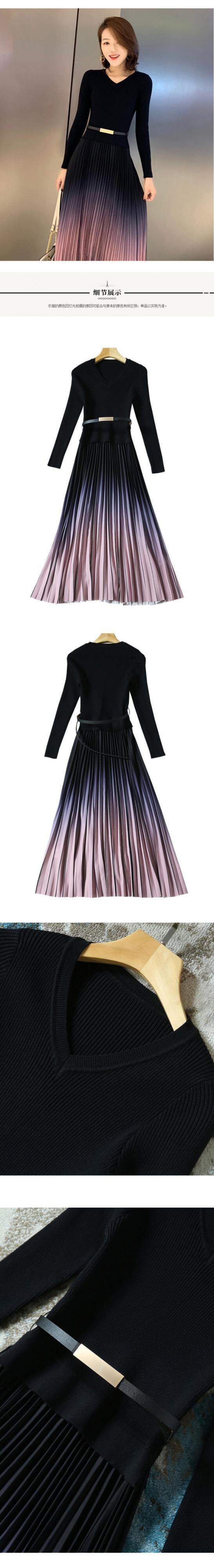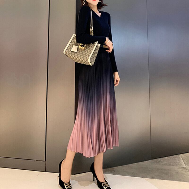 【新作】【送料無料】 SMTHMA2020春の女性のフルスリーブニットパッチワークドレスグラデーションプリーツセーターロングVestidos スプリング 春物 AL Feminine262778051010 | Feminine