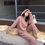 【新作】【送料無料】 2020秋冬ニットセーターフード付き女性トラックスーツ長袖カシミアプルオーバー伸縮性パンツスーツスポーツセット ロング エラスティック オータム 秋物 ウィンター 冬物 AL Feminine284007081501 | Feminine