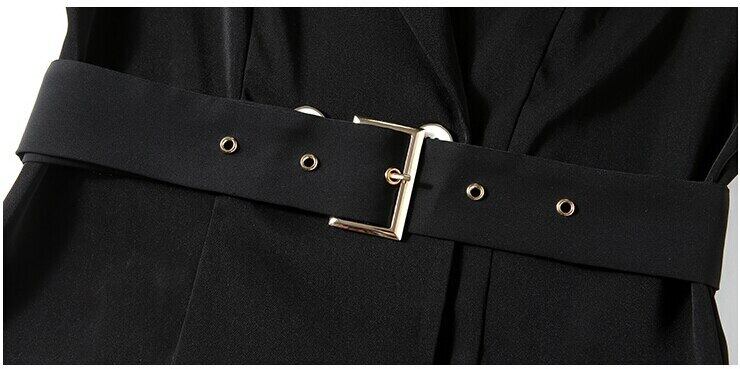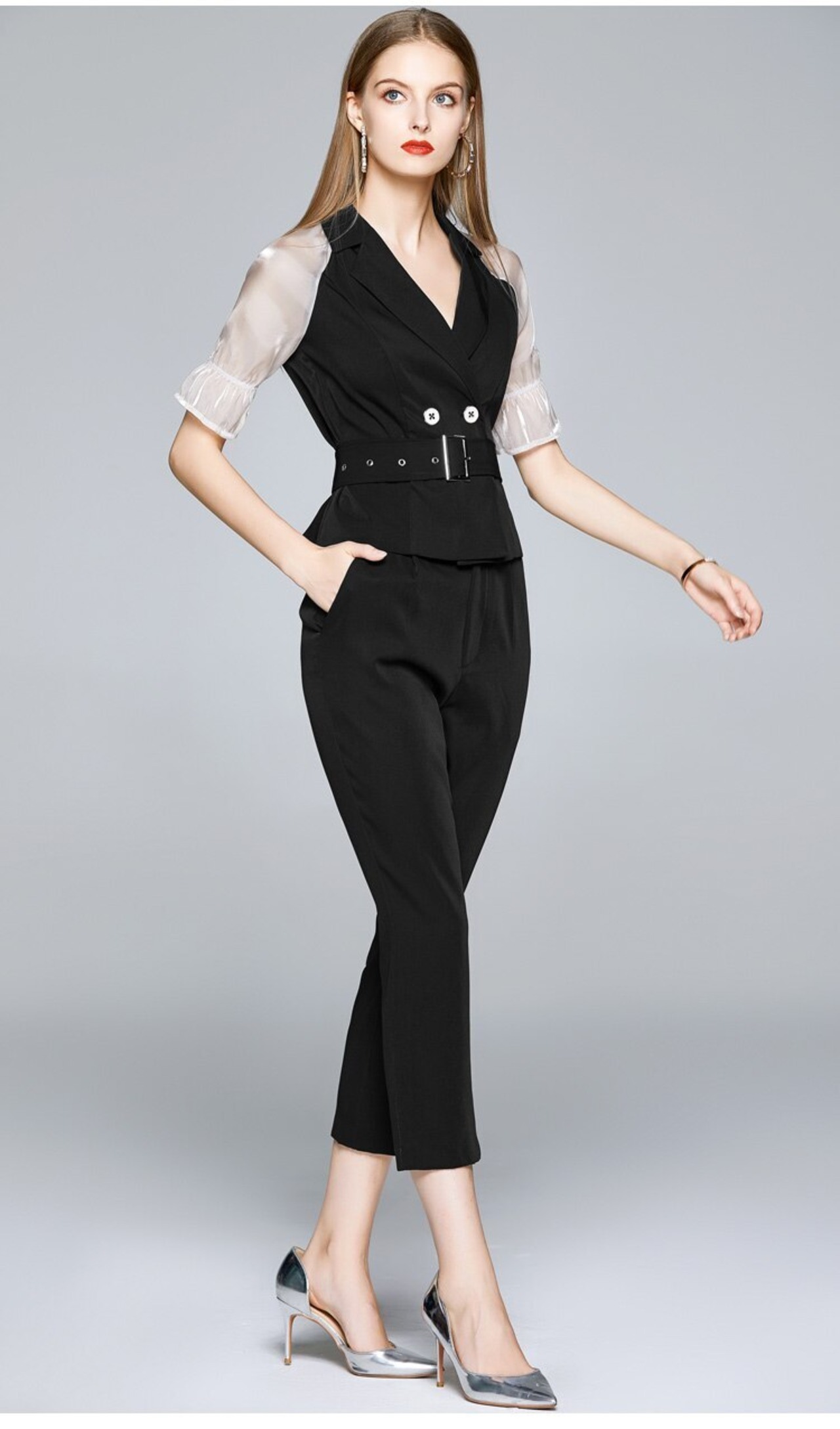 【新作】【送料無料】 ツーピースセットレディースターンダウンカラーハーフスリーブダブルブレストトップス+ウエストブラックレディースパンツセット2020服 半袖 AL Feminine280482891225 | Feminine