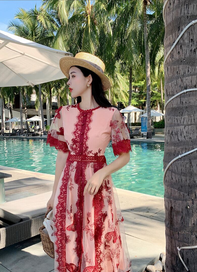 【新作】【送料無料】 SMTHMAレディースサマーロングドレスレースメッシュ刺繡バタフライウエストパフスリーブドレス 刺繍 夏物 AL Feminine210731336653