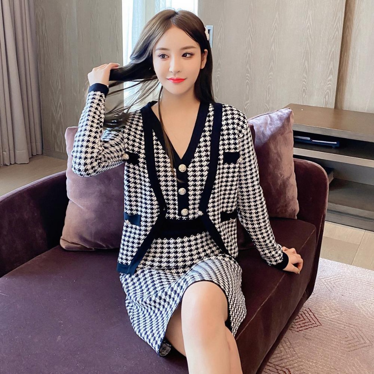 【新作】【送料無料】 SMTHMA 2020 Winter VintageHoundstoothニットカーディガン+2個スーツ女性シングルブレストベスト洋服セット ウィンター 冬物 ビンテージ AL Feminine236447873954 | Feminine