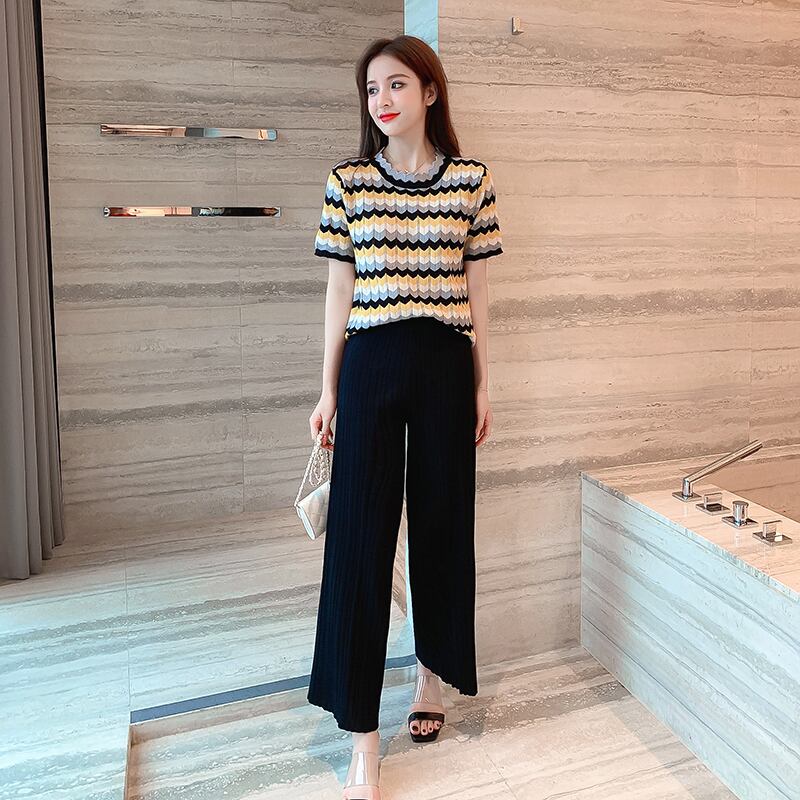 【新作】【送料無料】 2020年サマーラウンドネックプルオーバーストライプニット半袖セーター+ウエストワイドレッグニットパンツレディース2点セット 夏物 Oネック AL Feminine273905767187 | Feminine