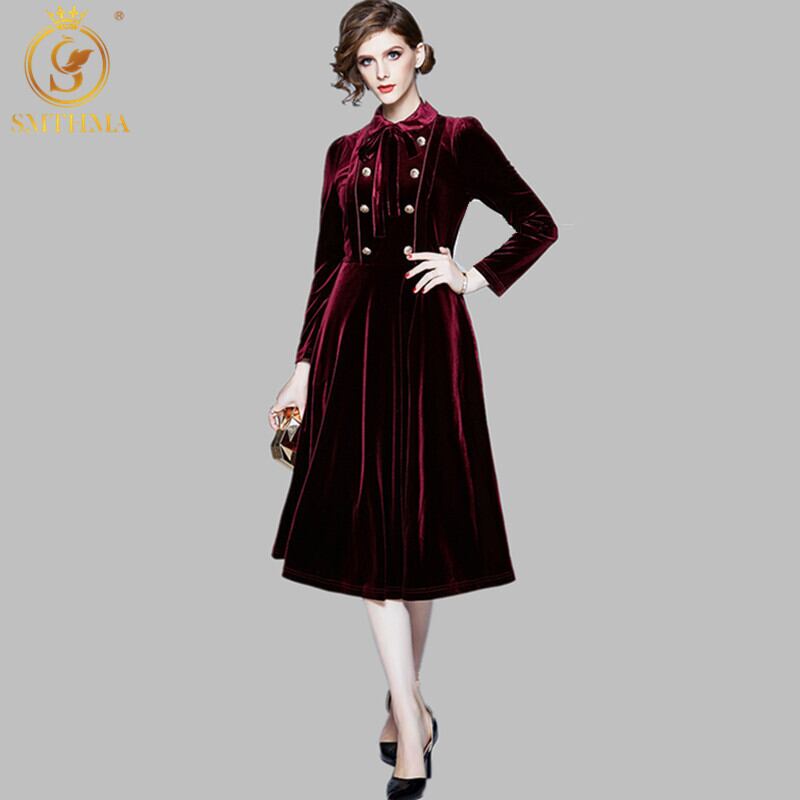 【新作】【送料無料】 SMTHMA2020ダブルブレストベルベットドレス女性冬長袖ボウオフィスレトロパーティードレス ロング リボン ウィンター 冬物 会社 学校 通勤や通学にも AL Feminine272079835831 | Feminine