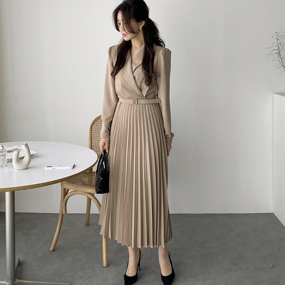 【新作】【送料無料】 SMTHMAターンダウンカラーシックな女性のドレスオフィスウェアプリーツベルトミディドレス2020秋のVestidos オータム 秋物 ハーネス 会社 学校 通勤や通学にも AL Feminine27031949033 | Feminine