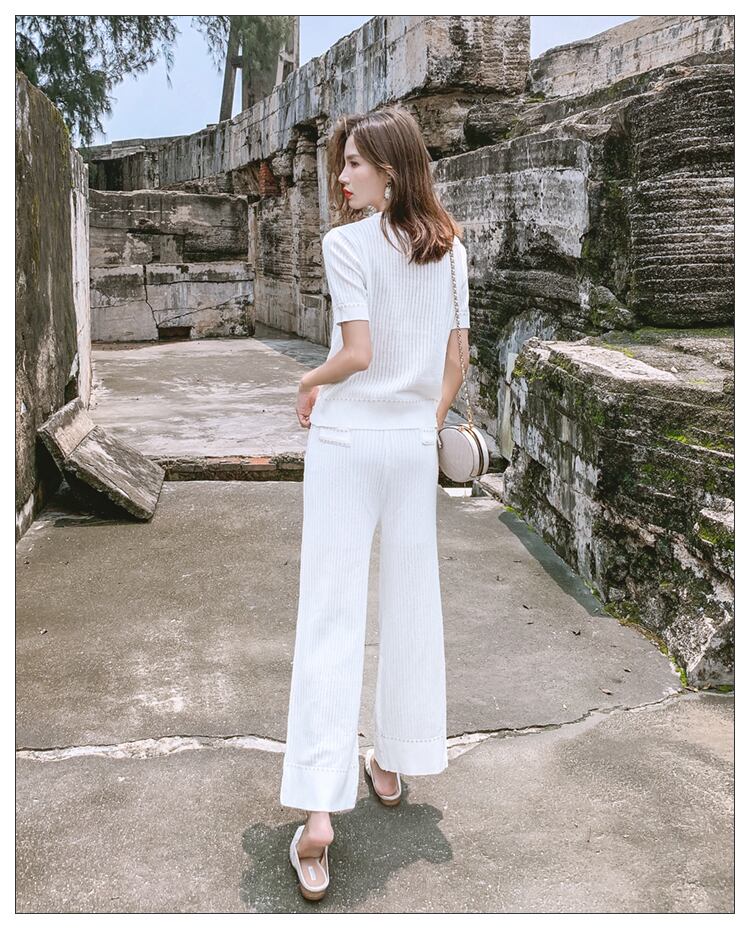 【新作】【送料無料】 2020年入荷サマーパンツスーツメスメタルバックル中空半袖セーター+ワイドレッグパンツツーピースセット 夏物 ワイドパンツ AL Feminine228632505911 | Feminine