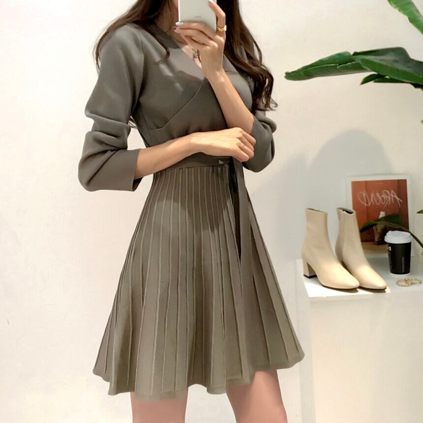 【新作】【送料無料】 SMTHMAセクシーなVネックニットドレス女性フルスリーブスリムウエストシックなセータードレス女性プリーツドレス AL Feminine229033841726 | Feminine
