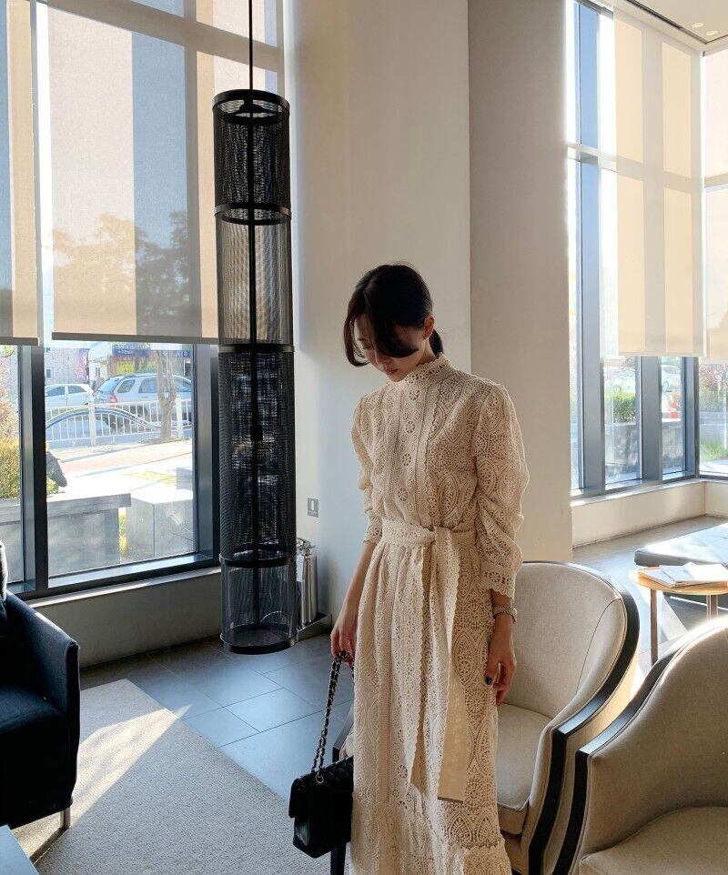 【新作】【送料無料】 SMTHMAレースロングドレス女性タートルネック長袖ドレスベルト付きヴィンテージスリム足首丈パーティードレス ハーネス ビンテージ AL Feminine244240604843