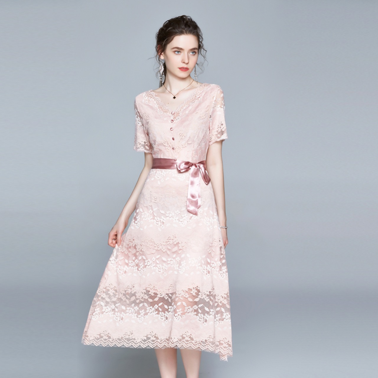 【新作】【送料無料】 SMTHMA2020夏の女性ピンクのレースのドレス半袖セクシーなVネックタイアップボウドレス休暇の休日の服 ショート リボン ハーフスリーブ サマー 夏物 AL Feminine280506658905 | Feminine