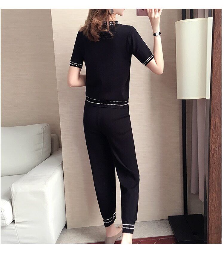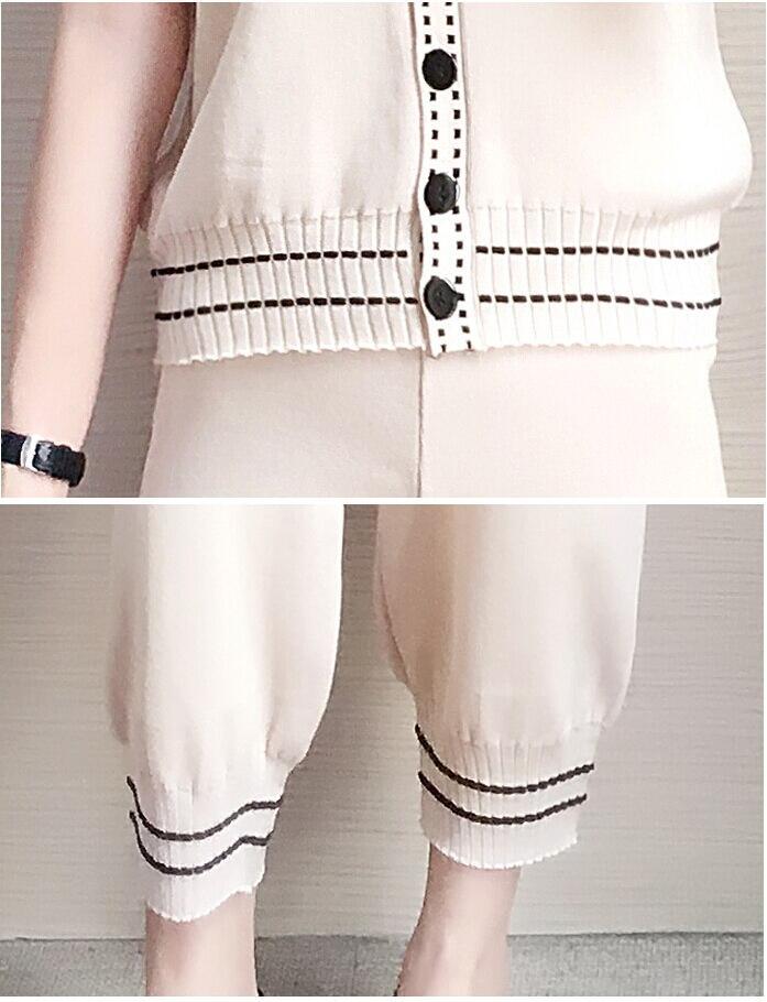 【新作】【送料無料】 夏の女性のニットセーターとパンツ2個セット半袖シングルブレストカーディガン+伸縮性ウエストパンツセット ショート ハーフスリーブ エラスティック サマー 夏物 AL Feminine220641937161