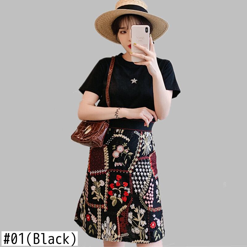 【新作】【送料無料】 2020プラスサイズレディース2ピースセットビーズブラックTシャツ+ウエストメッシュ刺繡スカートセットレディースサマースカートスーツ 刺繍 大きめサイズ 夏物 AL Feminine215808935326 | Feminine