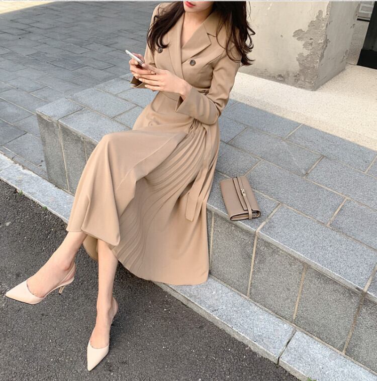 【新作】【送料無料】 SMTHMAシックなダブルブレストロングドレス2020秋の長袖ベルト付き女性ドレスVestidos オータム 秋物 ハーネス AL Feminine241627321915