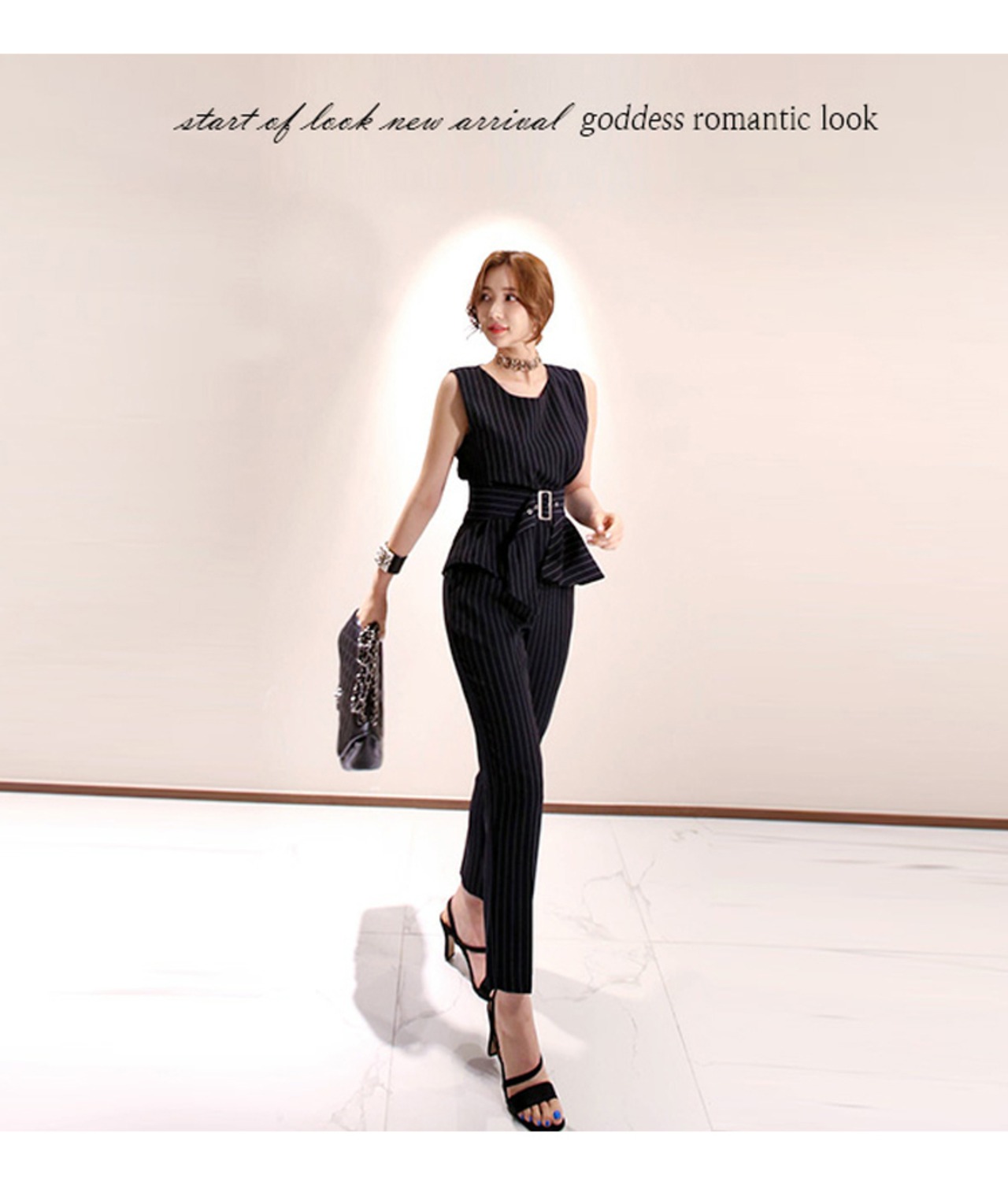 【新作】【送料無料】 2020年サマースーツレディースノースリーブTシャツ+フリルベルトとストライプロングパンツ3点セット 夏物 ハーネス AL Feminine285073229373 | Feminine