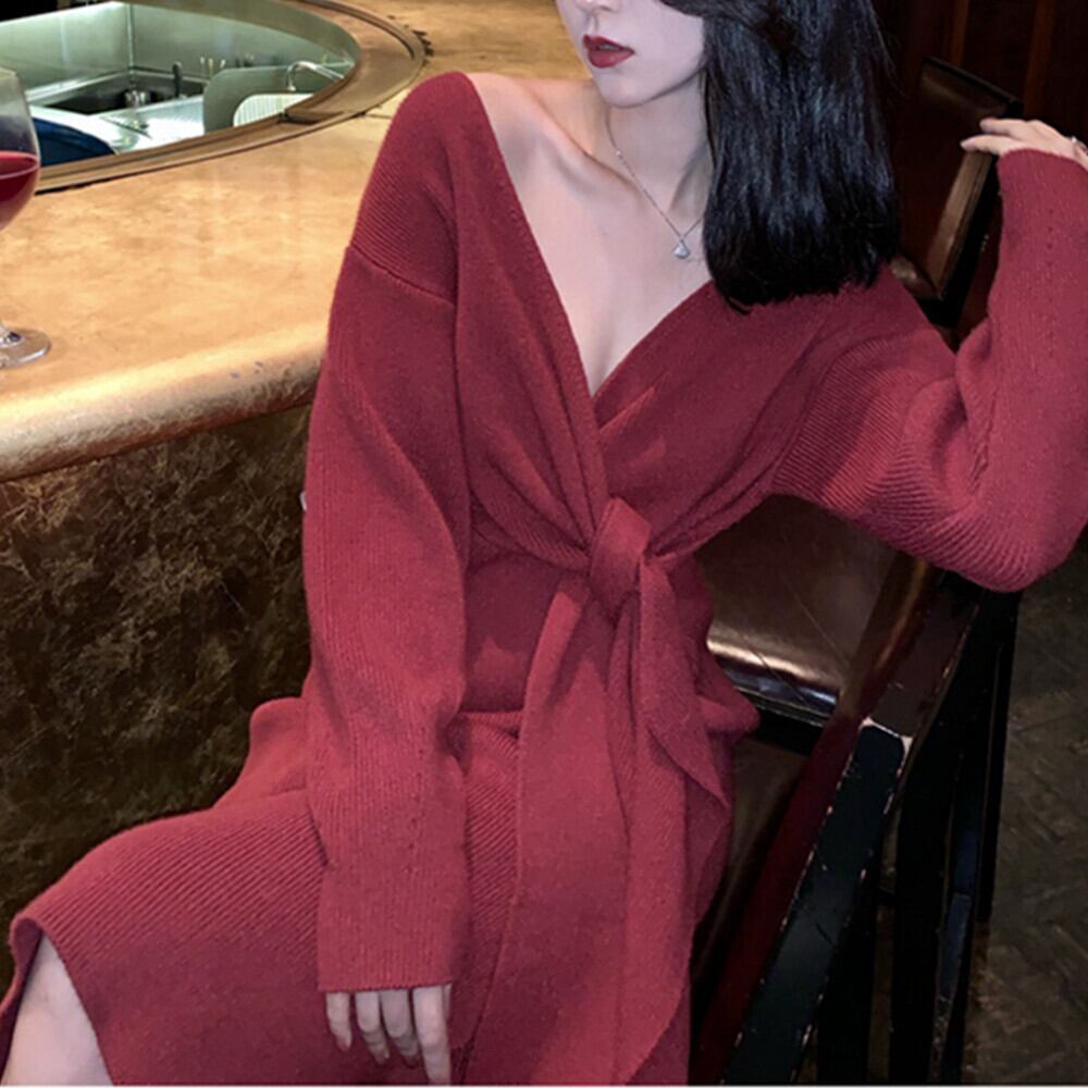 【新作】【送料無料】 SMTHMA秋冬女性ニットセータードレス2020長袖セクシーVネック赤いドレスウサギのヘアドレス ロング レッド オータム 秋物 ウィンター 冬物 AL Feminine298254715961 | Feminine