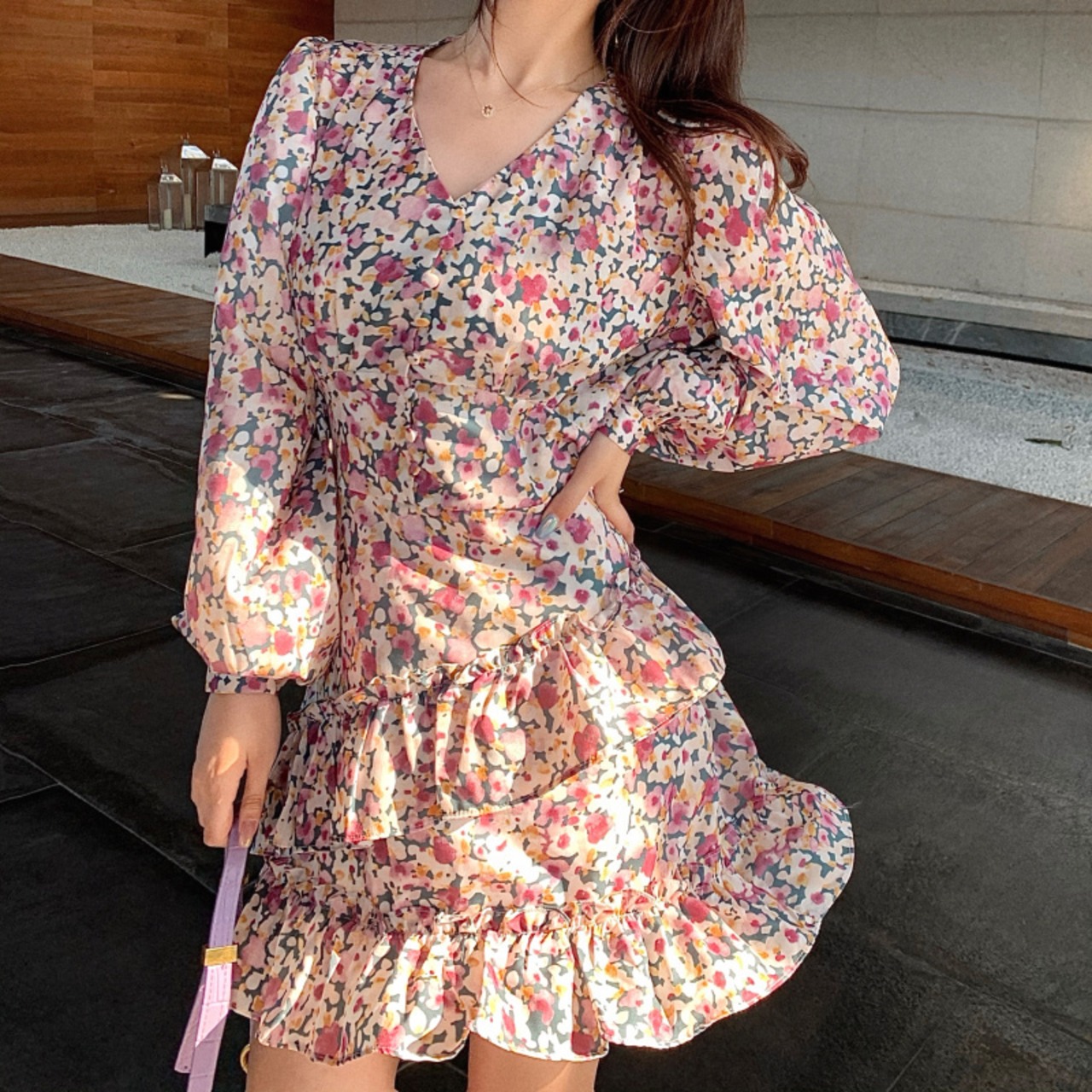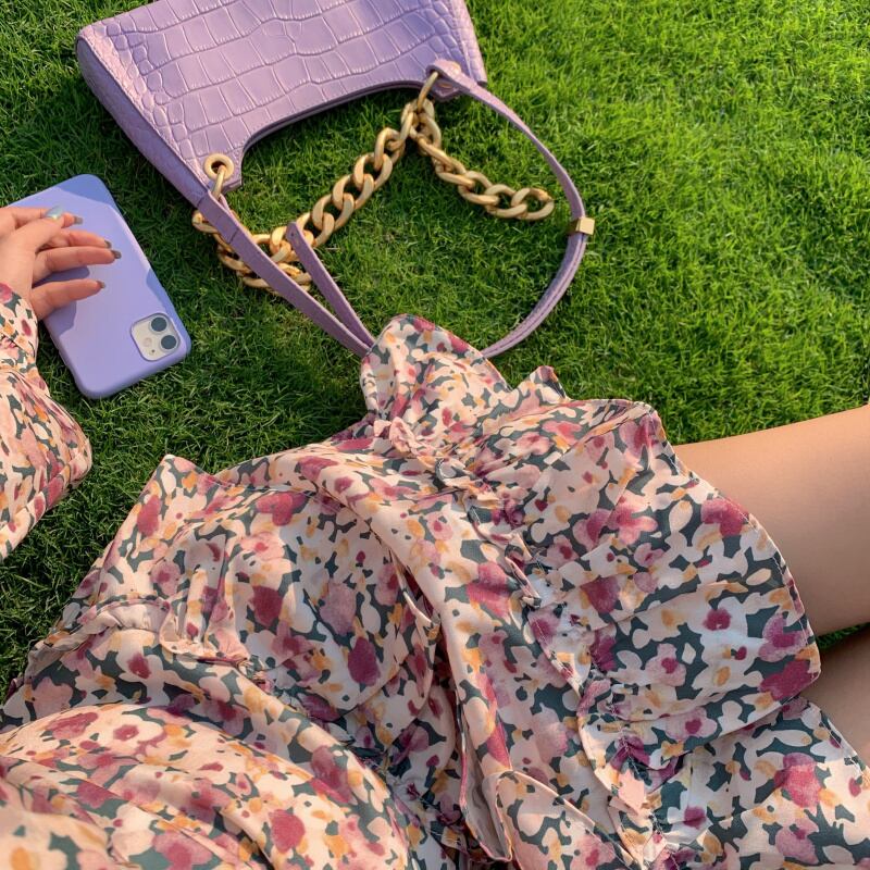 【新作】【送料無料】 Makefirmは花柄のドレスを提供しています長袖はウエストの春、夏、キキョウ、フランスの妖精シフォンVネックショーを受け入れます ロング スプリング 春物 サマー 夏物 Feminine152160805107 | Feminine
