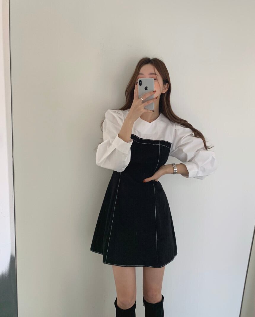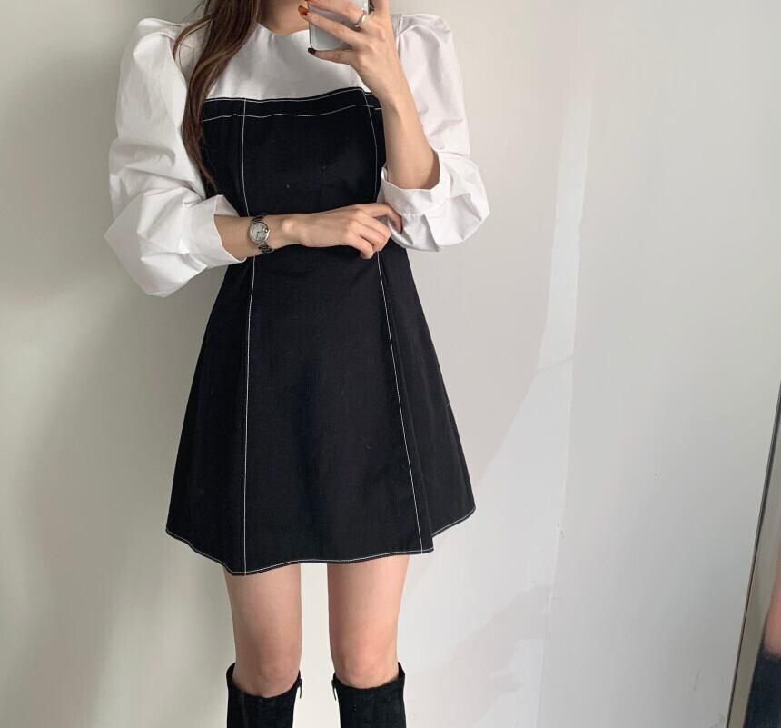 【新作】【送料無料】 パッチワークラインドレスOネックミニパフ長袖ショートシックブラック春夏2021パーティーキュートな女性原宿ヴェスティドス ロング 大人ガーリー スウィート カジュアル かわいい スプリング 春物 サマー 夏物 Aライン Feminine158324012865 | Feminine
