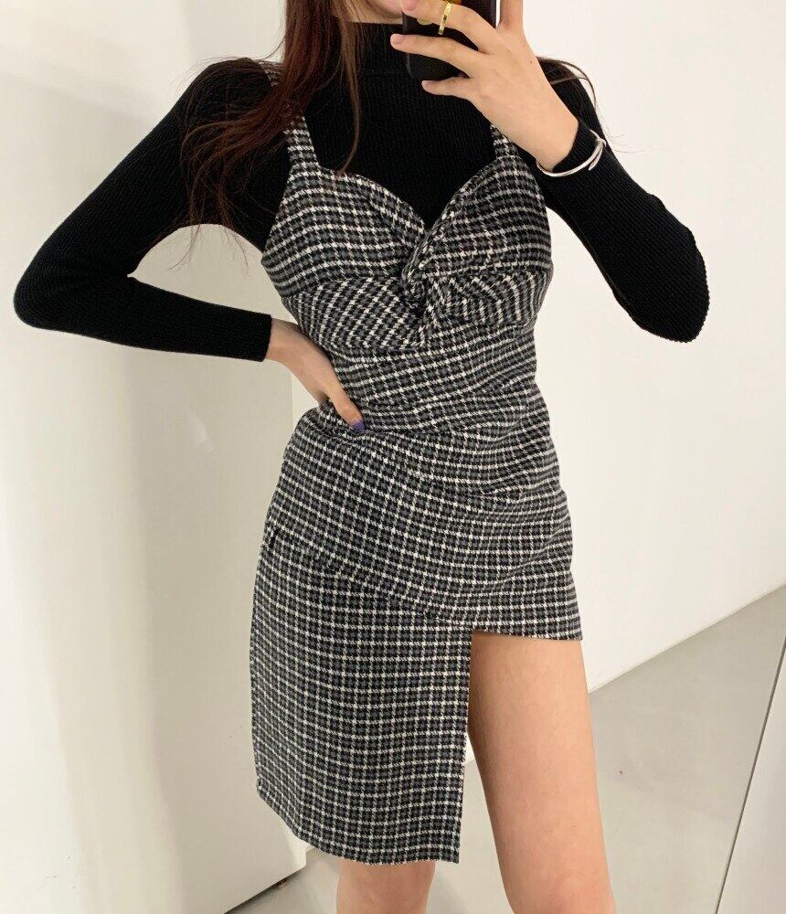 【新作】【送料無料】 2Stpieceスパゲッティストラップチェック柄ドレス長袖セータートップミニイレギュラーショートドレススタイル原宿春2021 ロング かわいい スプリング 春物 Feminine153813529840 | Feminine