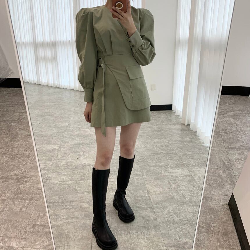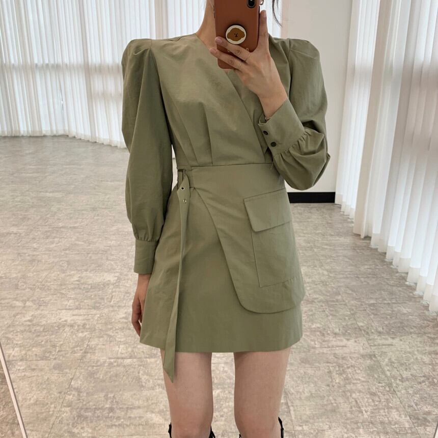 【新作】【送料無料】 コットンAラインドレスミニパフ長袖Vネック無地ブラックグリーンシャツカジュアルファッションオフィス2021春秋 ロング スプリング 春物 オータム 秋物 ソリッドカラー 会社 学校 通勤や通学にも Feminine142237914495 | Feminine