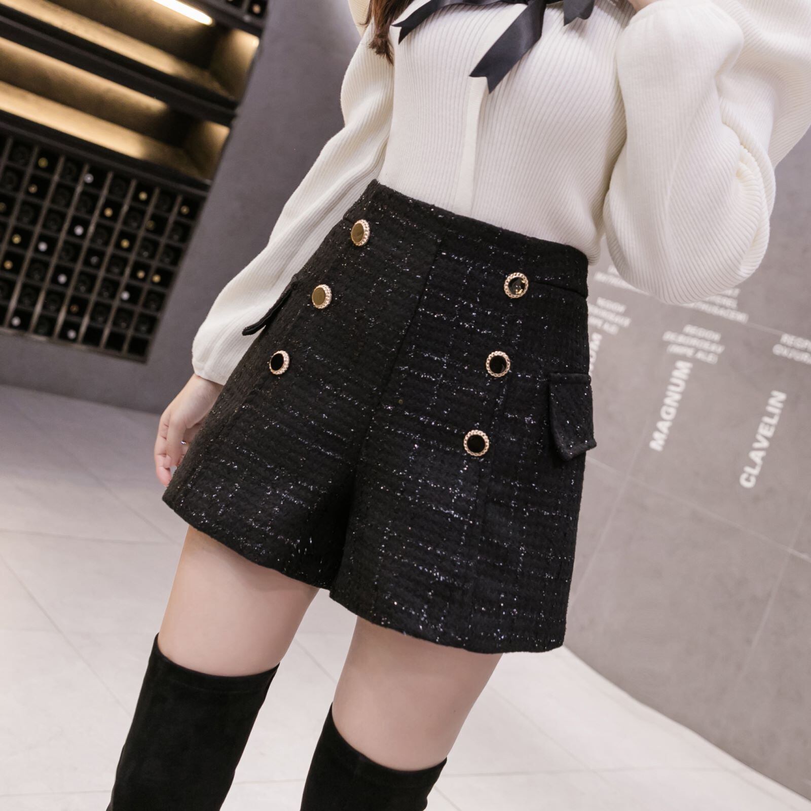 【新作】【送料無料】 オータムウエストワイドレッグツイードウールショーツレディースブラックブライトシルクダブルブレストボタンパンタロンコルトスデムジェ 秋物 ブルマー ワイドパンツ AL Feminine251366656297 | Feminine