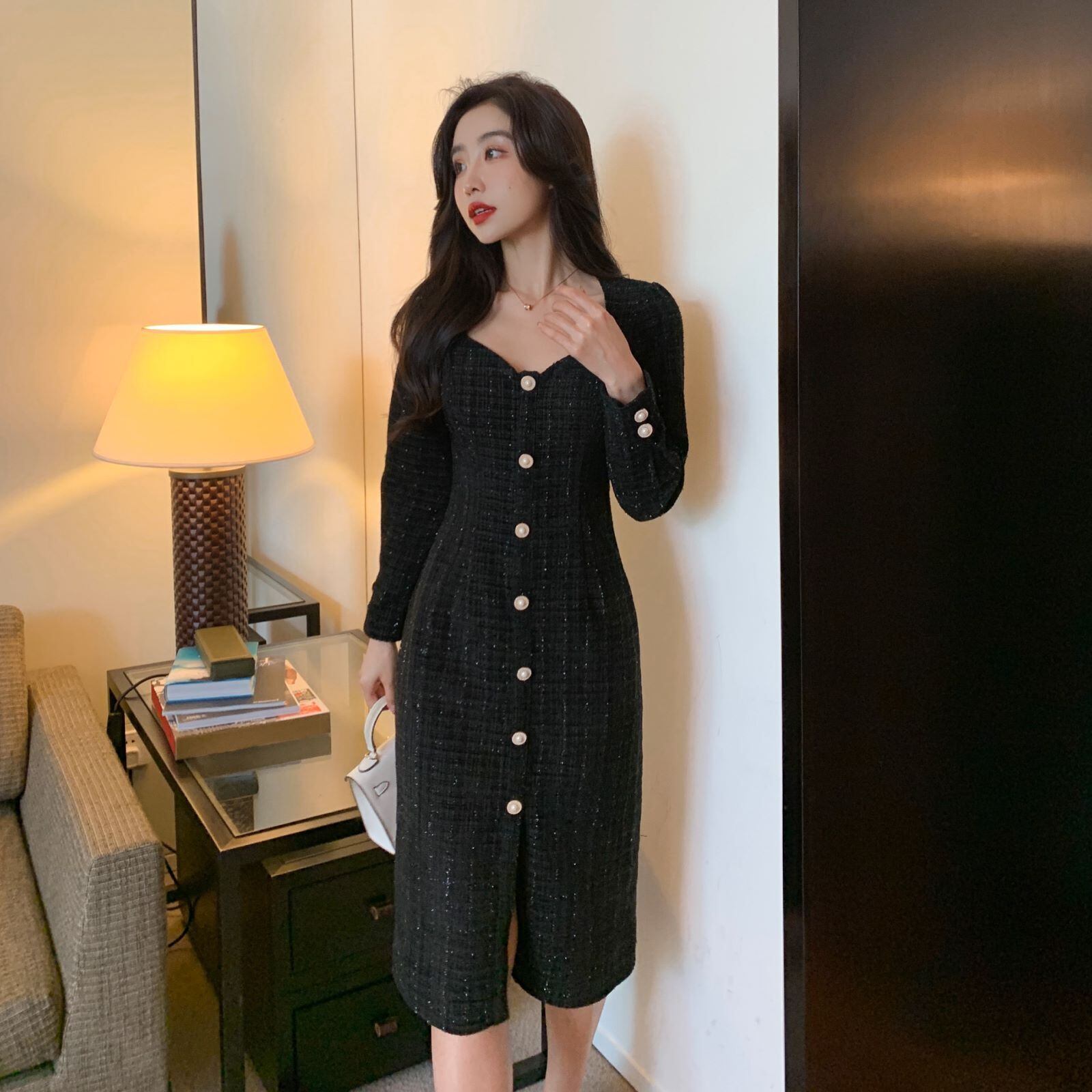 【新作】【送料無料】 SMTHMAヴィンテージ女性黒ツイード長袖ミドル丈ドレス秋のシングルブレストオフィスOLVesitdos ロング ブラック オータム 秋物 ビンテージ 会社 学校 通勤や通学にも AL Feminine244493059414 | Feminine