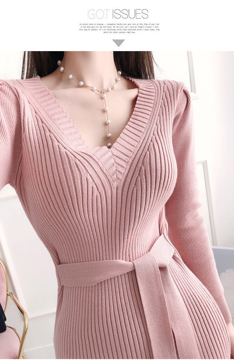 【新作】【送料無料】 SMTHMAシックなベルト付き女性セータードレスセクシーなVネック長袖ニットAライン秋冬Vestidos ロング オータム 秋物 ウィンター 冬物 ハーネス AL Feminine224387195672 | Feminine