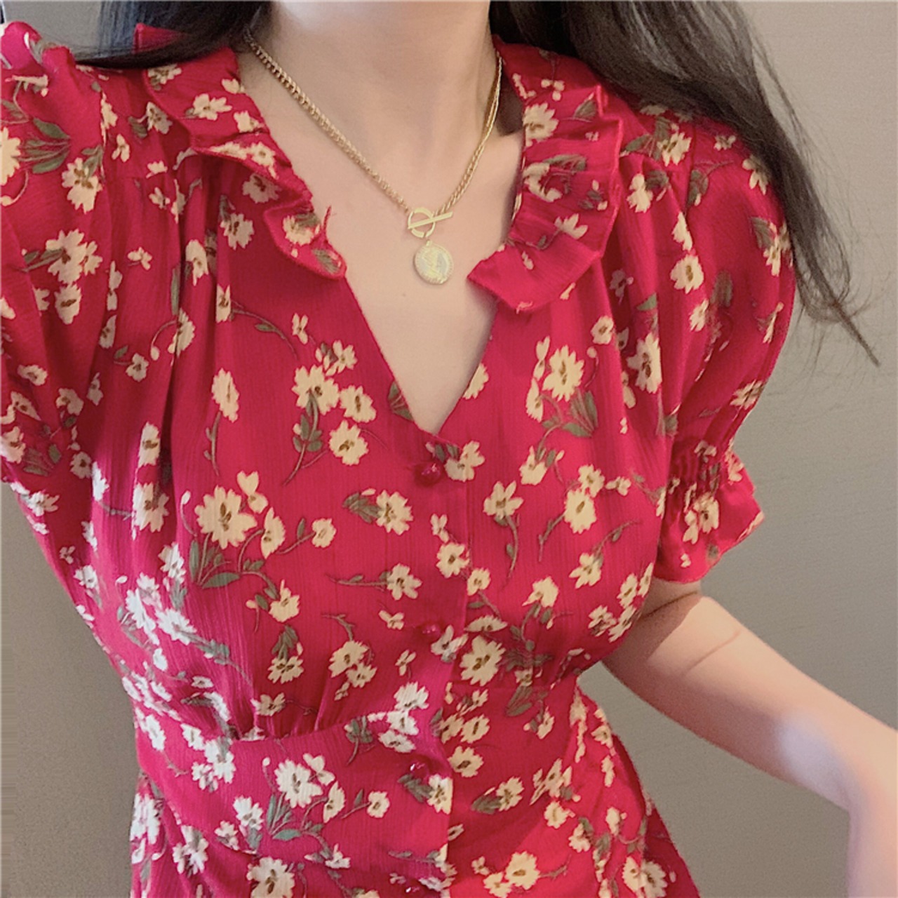 【新作】【送料無料】 ボタンフローラルシフォンレディースドレスVネックパフスリーブミニ自由奔放に生きるビーチVestidosCortosサマーローブ2021レッドハラジュクジャーク かわいい 夏物 花柄 Feminine122827109605 | Feminine