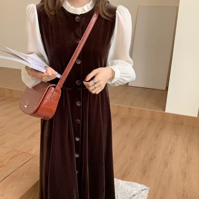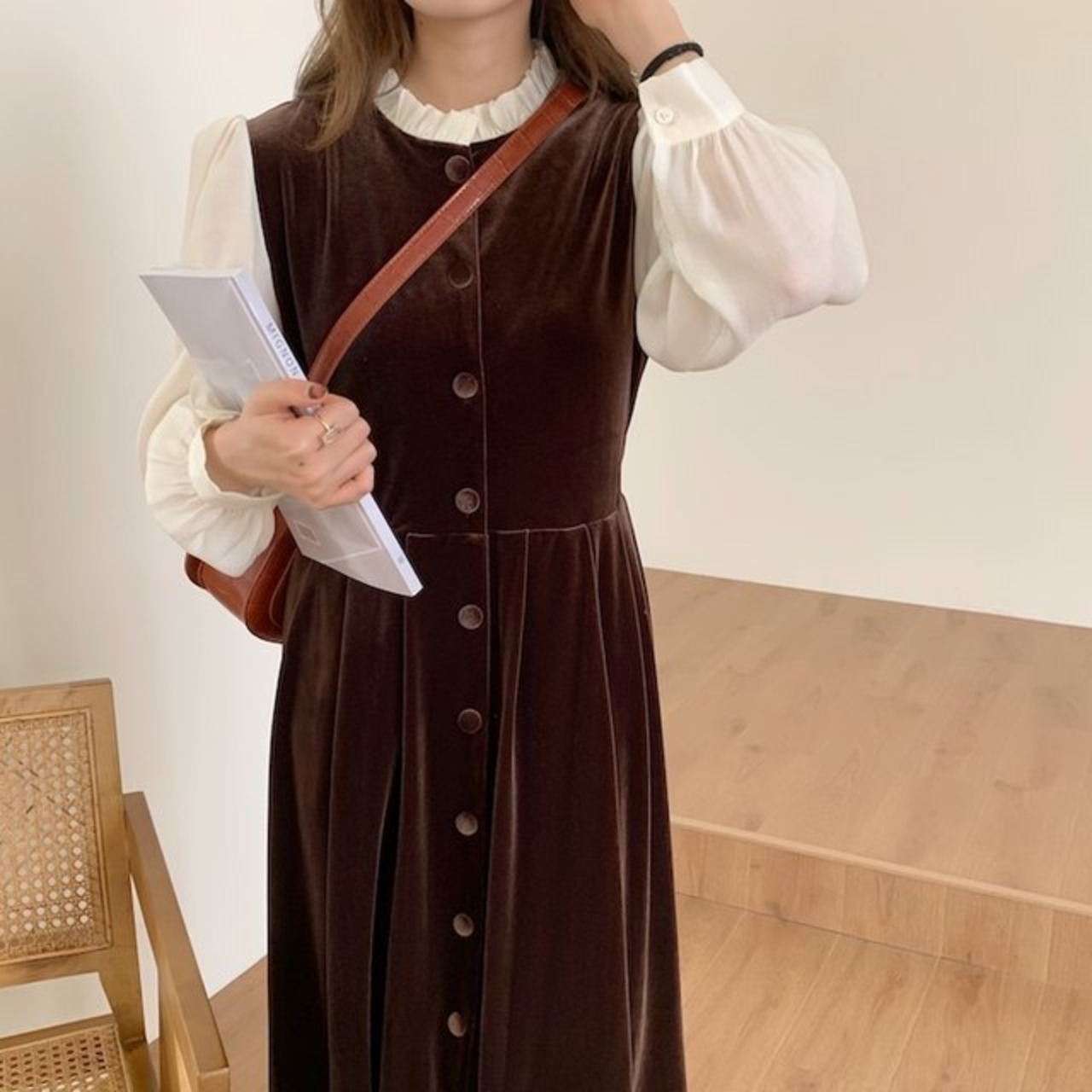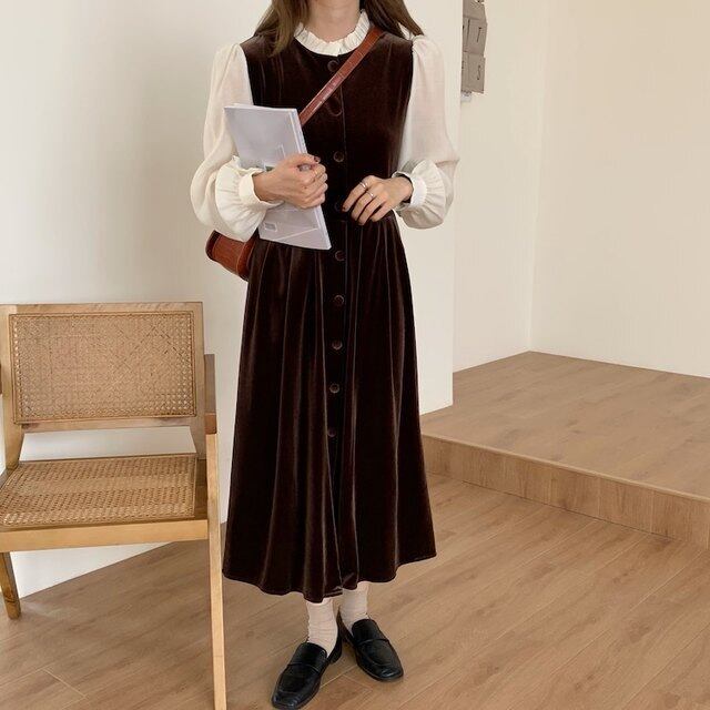 【新作】【送料無料】 SMTHMAスタンドカラーウエストVestidoDeVelvetパッチワークフェイク2枚長袖ドレス秋春 ロング スプリング 春物 オータム 秋物 AL Feminine246167114436 | Feminine