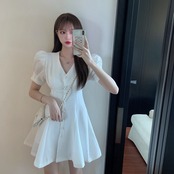 【新作】【送料無料】 VネックボタンホワイトドレスミニAラインパフスリーブVestidosDe Verano2021黒人女性コルトス原宿南かわいい ブラック 大人ガーリー スウィート キュート カジュアル Feminine195107571201 | Feminine