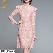 【新作】【送料無料】 SMTHMA2021ランウェイスプリングピンクレースドレスレディーススタンドカラー長袖ホローアウトパーティーVestidos ロング 春物 AL Feminine250906087891 | Feminine