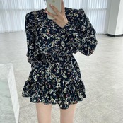 【新作】【送料無料】 ヴィンテージフローラルプリントパフ長袖フリルマーメイドミニドレス女性シフォンセクシーウエストヒップローブヴェスティドス2021年春 ロング ラッフル スプリング 春物 花柄 ビンテージ Feminine149797891161 | Feminine