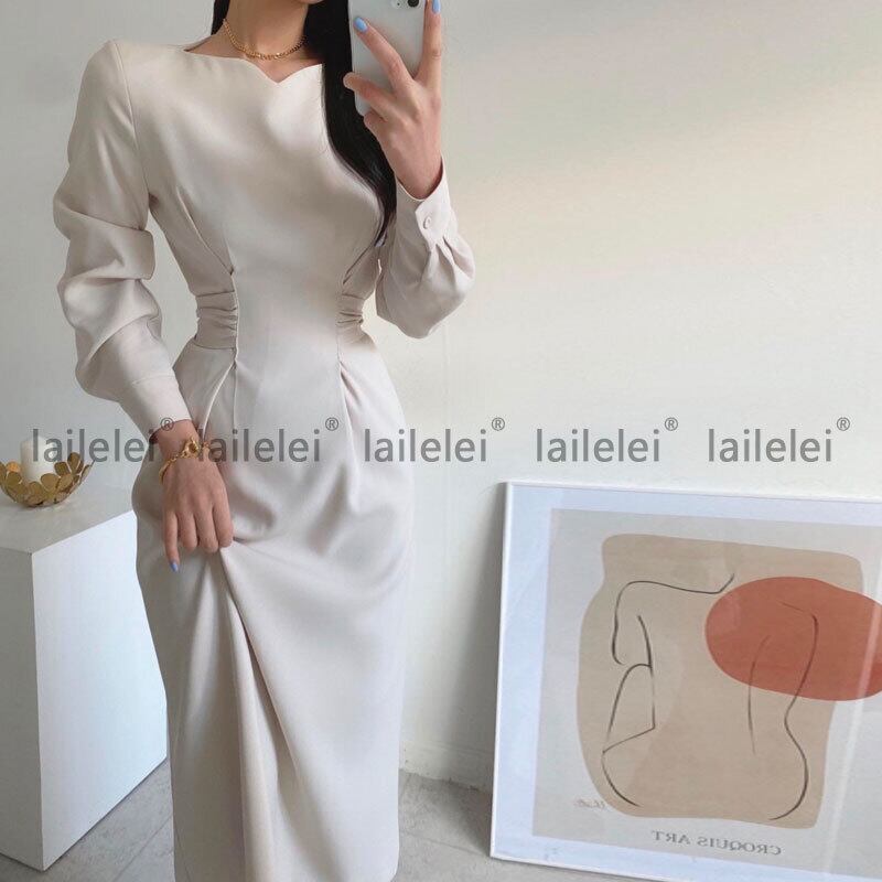 【新作】【送料無料】 オフホワイト長袖ドレスミディブラックサウスドレス女性2021年秋春ローブシックイブニングスキエンカ ロング スプリング 春物 オータム 秋物 Feminine190215437135 | Feminine