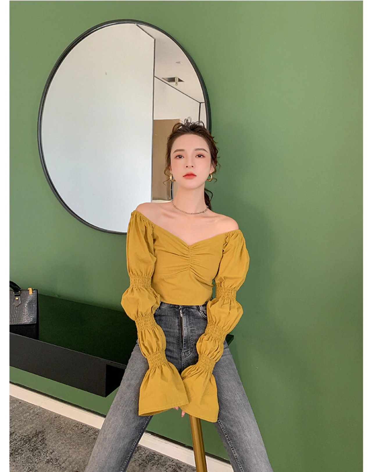 【新作】【送料無料】 SMTHMAフレア長袖シャツ女性2021年春のスクエアカラーフレンチフォールドショートトップ ロング スプリング 春物 スクウェア AL Feminine2780360327 | Feminine
