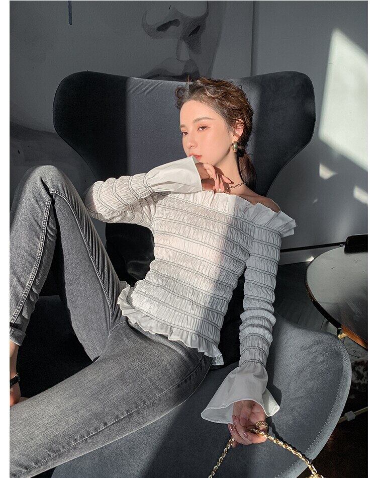 【新作】【送料無料】 SMTHMAフリルセクシーオフショルダーフレア長袖シャツ女性2021年春スリムボトムトップス ロング スプリング 春物 AL Feminine219606264407 | Feminine