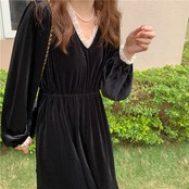 【新作】【送料無料】 パッチワークフリルベルベットAラインドレスミニブラックVネックコートスタイルエレガントレトロショートドレスパーティー2021春 スプリング 春物 Feminine179179902887 | Feminine